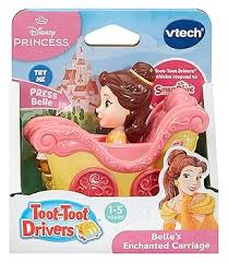 Bonjour! My name's Belle. What a beautiful day! Ride into a journey of wonder with the Toot-Toot Drivers Belle's Enchanted Carriage by VTech This wonderful carriage is perfectly sized for little hands and will delight your child with bright flashing lights, magical music, recognisable sound effects, and beautiful songs all in Belle's real voice! Push the carriage to trigger more fun princess reactions! Includes 3 sing-along songs and 6 lively melodies.